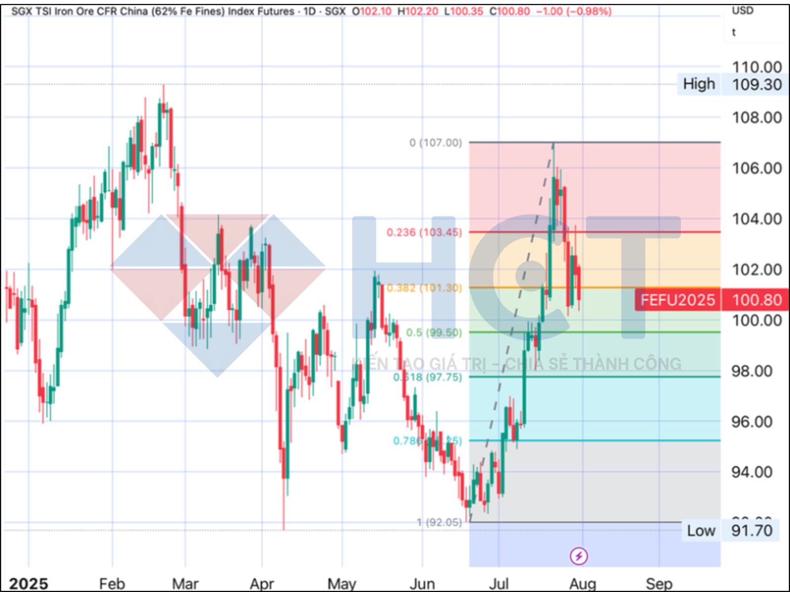 Phân tích Fibonacci thoái lui: Giá đang dao động trong vùng giữa mốc 0% và 50% của chỉ báo Fibonacci thoái lui. Trong ngắn hạn, nếu không có thông tin cơ bản mới, giá quặng sắt IO dự kiến sẽ giao dịch trong vùng 99,50 USD/tấn (hỗ trợ) và 103,45 USD/tấn (kháng cự).