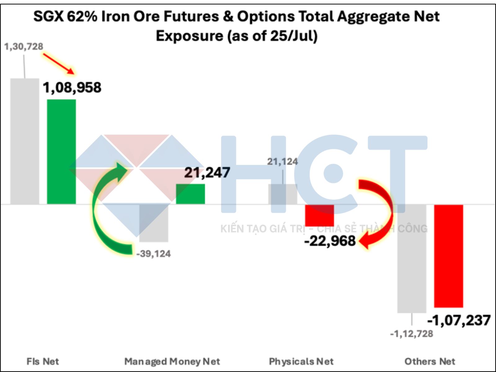 Các nhà đầu tư thuộc nhóm quỹ đầu cơ đang nắm giữ vị thế mua ròng 21,2 nghìn hợp đồng trên tất cả các kỳ hạn hợp đồng tương lai và quyền chọn quặng sắt, chuyển sang trạng thái mua ròng từ tuần trước. Tổng số vị thế mở hợp đồng tương lai và quyền chọn tăng 6% so với tuần trước.