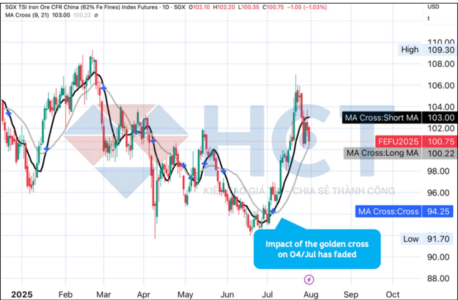 Ngắn hạn: Hiện giá đang thấp hơn đường trung bình động 9 ngày (-2,2%) và chỉ cao hơn nhẹ so với đường trung bình động 21 ngày (+0,5%). Đường MA 21 ngày (100,22 USD/tấn) đang đóng vai trò hỗ trợ quan trọng.