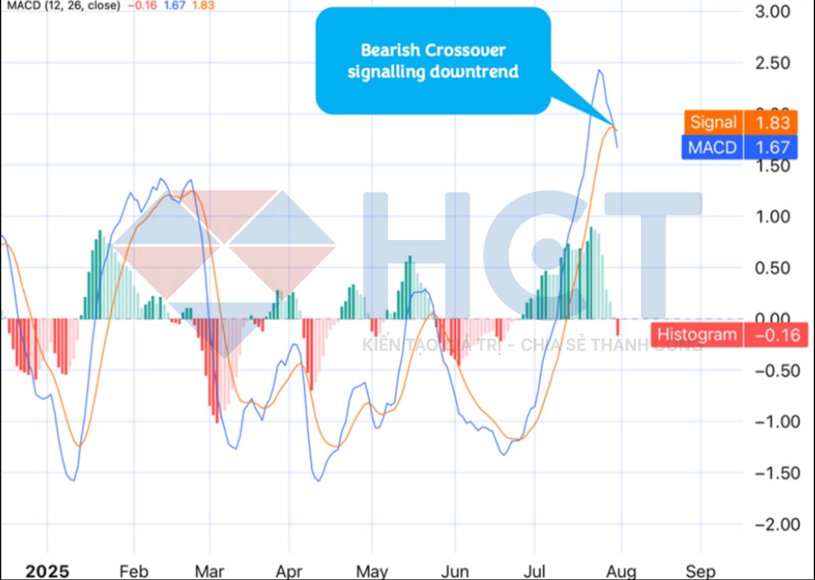Xung lượng giá: Chỉ báo MACD ghi nhận tín hiệu “giao cắt tử thần” khi đường MA 12 ngày cắt xuống dưới MA 26 ngày. Histogram âm xác nhận áp lực giảm, cho thấy khả năng giá sẽ điều chỉnh giảm trong ngắn hạn.