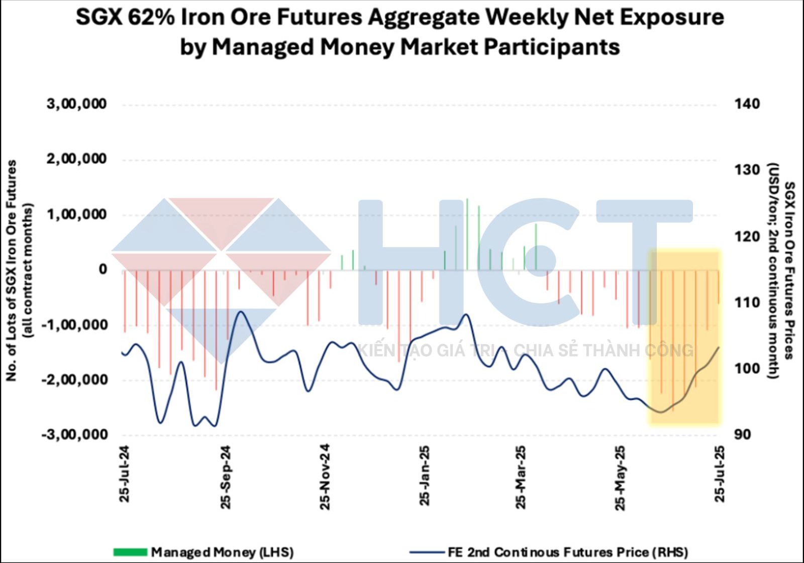 Nhóm quỹ đầu cơ phần lớn duy trì quan điểm bi quan trong suốt năm nay, chỉ có một giai đoạn tăng giá ngắn vào đầu năm 2025. Nhóm này thường phản ứng đồng nhịp với biến động giá quặng sắt, gia tăng vị thế bán khi giá giảm và thu hẹp vị thế khi giá phục hồi.