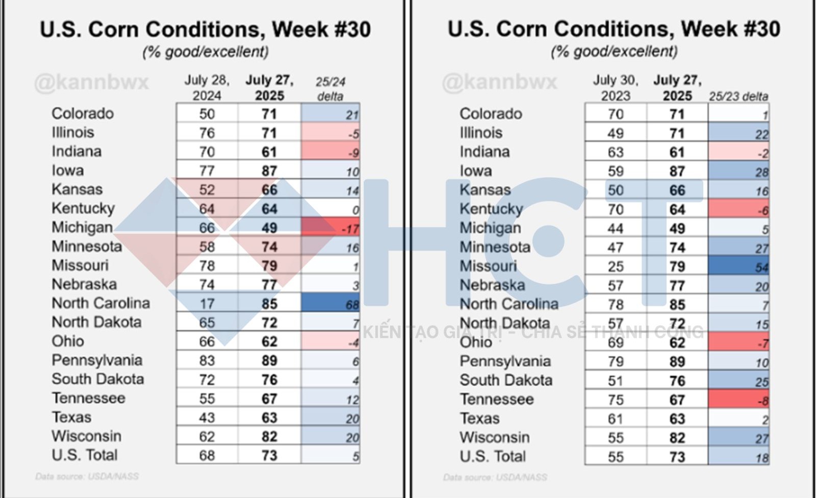 Tính đến ngày 27/7/2025 (tuần 30), USDA đánh giá 73% diện tích ngô Mỹ ở tình trạng “tốt đến rất tốt” mức cao nhất kể từ năm 2016, với bang Iowa dẫn đầu đạt 87%. Điều này cho thấy triển vọng một vụ mùa bội thu.