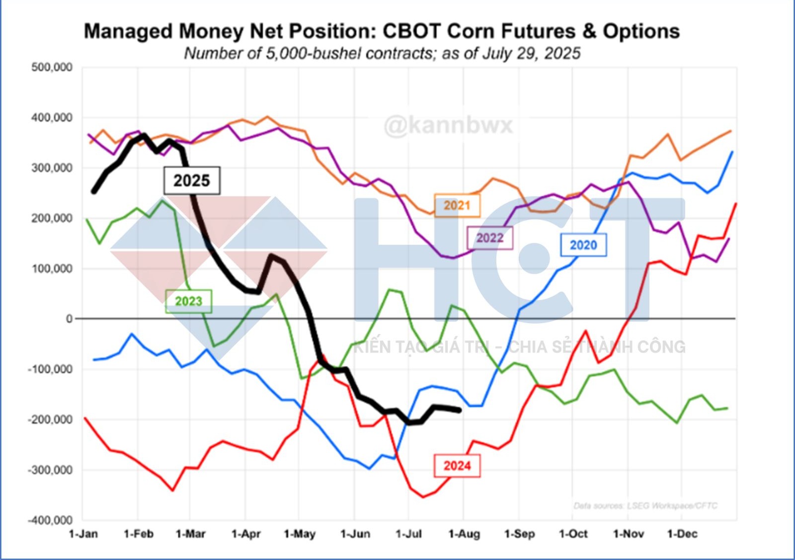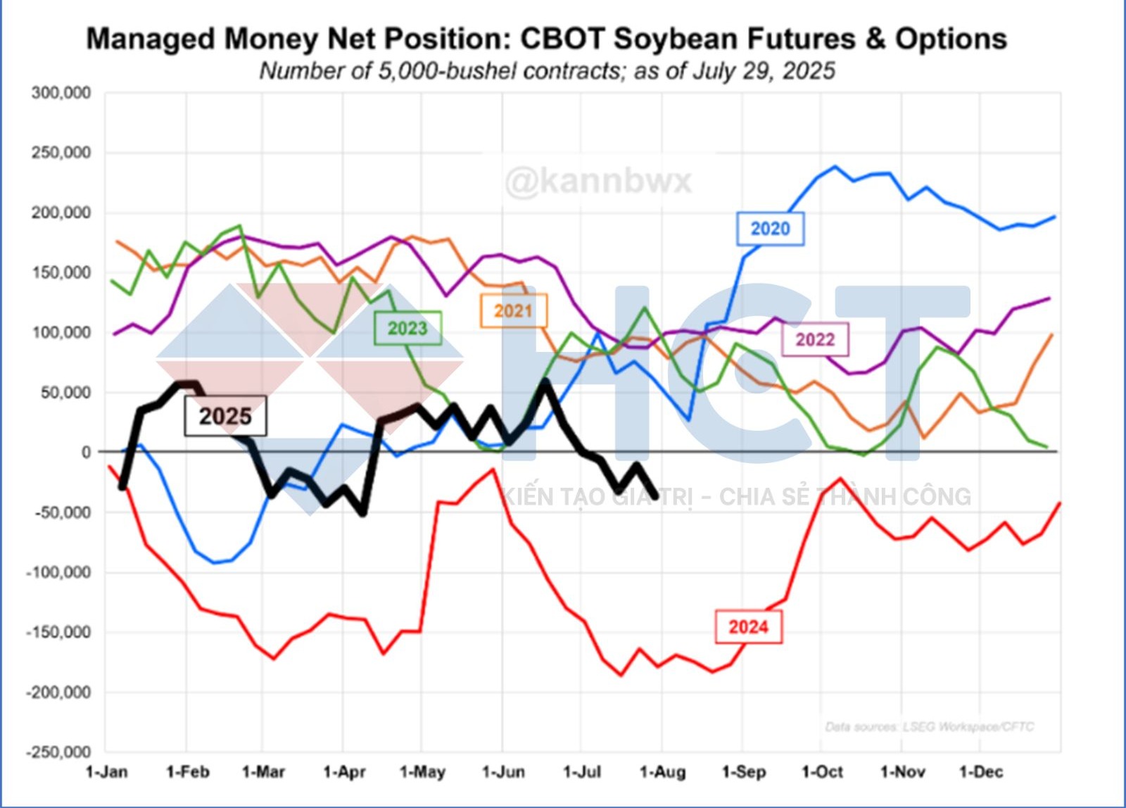 Tương tự, các quỹ đầu cơ đã thiết lập quan điểm bi quan mạnh nhất đối với thị trường hợp đồng tương lai và quyền chọn đậu tương CBOT kể từ đầu tháng 4. Vị thế bán ròng đạt 36.311 hợp đồng, tăng thêm khoảng 25.000 hợp đồng trong tuần, nhưng vẫn thấp hơn đáng kể so với mức 178.591 hợp đồng cùng kỳ năm trước, vốn chỉ kém đôi chút so với kỷ lục bán ròng được thiết lập vào giữa năm 2024.