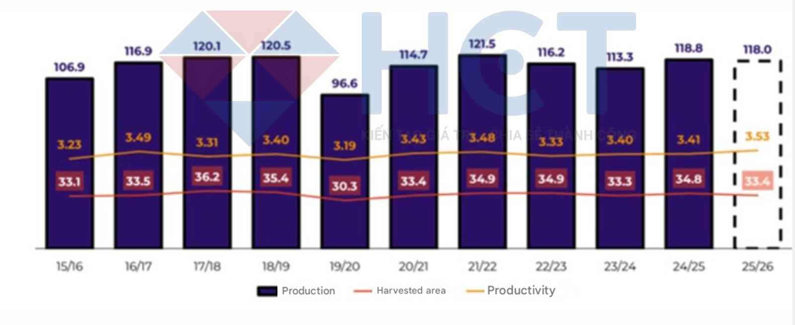 Niên vụ 2025/26 được dự báo ghi nhận sự gia tăng sản lượng và xuất khẩu dầu cọ tại hai quốc gia sản xuất lớn nhất thế giới là Indonesia và Malaysia. Đáng chú ý, Ấn Độ thị trường nhập khẩu dầu cọ lớn nhất toàn cầu đã giảm thuế nhập khẩu và dự kiến nâng khối lượng mua lên 8,7 triệu tấn, so với mức 7,8 triệu tấn trước đó.
