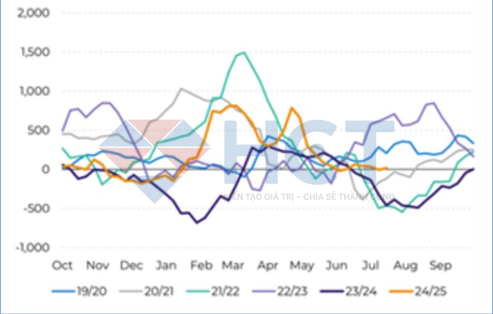 Nhập khẩu niên vụ 2024/25 được điều chỉnh giảm từ 108 triệu xuống 106,5 triệu tấn, phản ánh nhu cầu yếu do quá trình tái xây dựng tồn kho và lợi nhuận nghiền thấp. Dù vậy, Bộ Nông nghiệp Mỹ (USDA) dự báo nhập khẩu có thể tăng lên 112 triệu tấn trong năm 2025/26, nếu biên lợi nhuận nghiền và tiêu thụ nội địa được cải thiện.
