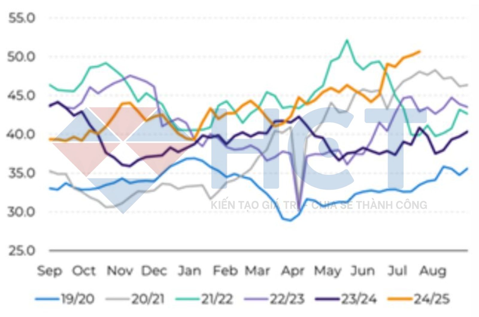 Trong khi đó, nguồn cung khô đậu được dự báo dư thừa do nhu cầu thức ăn chăn nuôi ổn định, khiến tồn kho có khả năng tăng gấp ba lần và tạo áp lực giảm giá. Ngược lại, dầu đậu tương được hưởng lợi từ nhu cầu tiềm năng tăng, tồn kho thắt chặt và biên lợi nhuận tích cực, giúp triển vọng giá duy trì xu hướng tăng. Hiện tại, tỷ trọng dầu trong biên lợi nhuận nghiền đạt gần 50%, mức cao nhất kể từ niên vụ 2021/22, vốn đủ cơ sở để hỗ trợ giá đậu tương Chicago trên 12 USD/giạ. Tuy nhiên, thị trường vẫn đang giao dịch trong khoảng 10,00–10,50 USD/giạ, cho thấy sự chênh lệch đáng kể giữa các yếu tố cơ bản và diễn biến giá thực tế.