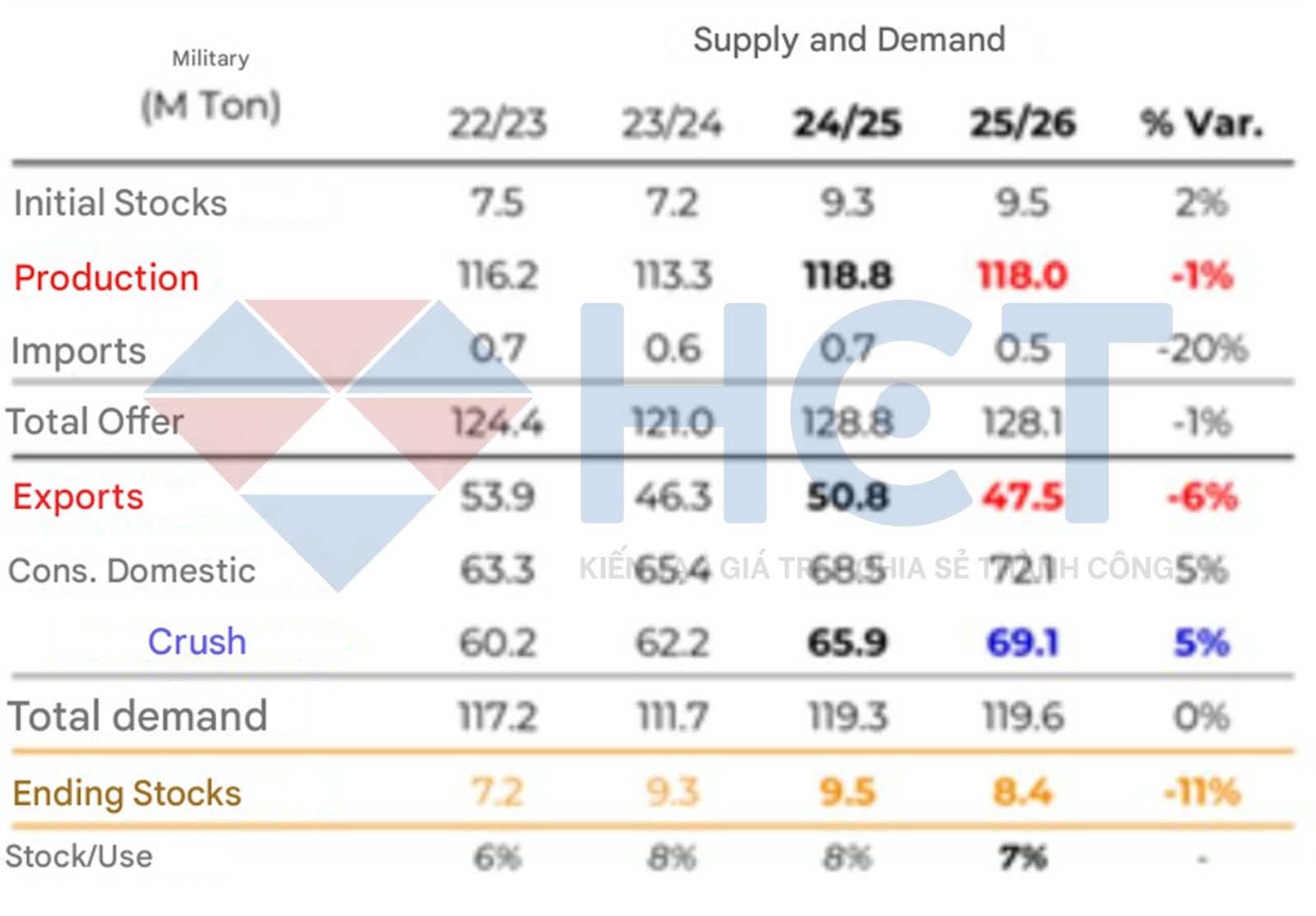 Bước sang niên vụ 2025/26, dự kiến một phần diện tích trồng đậu tương sẽ được chuyển sang ngô nhờ lợi nhuận hấp dẫn hơn. Xu hướng này củng cố định hướng của Argentina tập trung vào hoạt động nghiền ép và xuất khẩu các sản phẩm phụ như khô đậu và dầu đậu, qua đó tạo áp lực cạnh tranh lớn hơn đối với các nhà xuất khẩu hàng đầu như Brazil và Mỹ. Ngành chế biến trong nước tiếp tục duy trì công suất mạnh và ưu tiên phục vụ thị trường xuất khẩu.