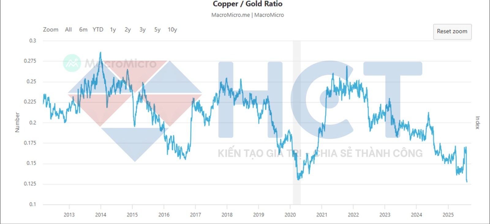 Tỷ lệ giá đồng/gold rơi xuống mức thấp nhất trong nhiều thập kỷ, thấp hơn cả giai đoạn khủng hoảng tài chính 2008 và đại dịch 2020, báo hiệu tâm lý lo ngại tăng trưởng dài hạn đang chi phối toàn thị trường hàng hóa.