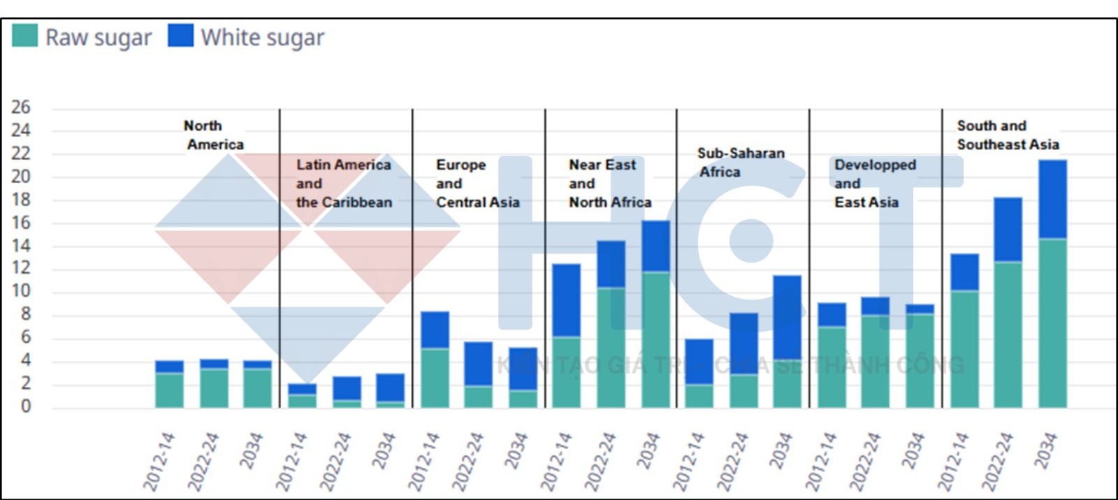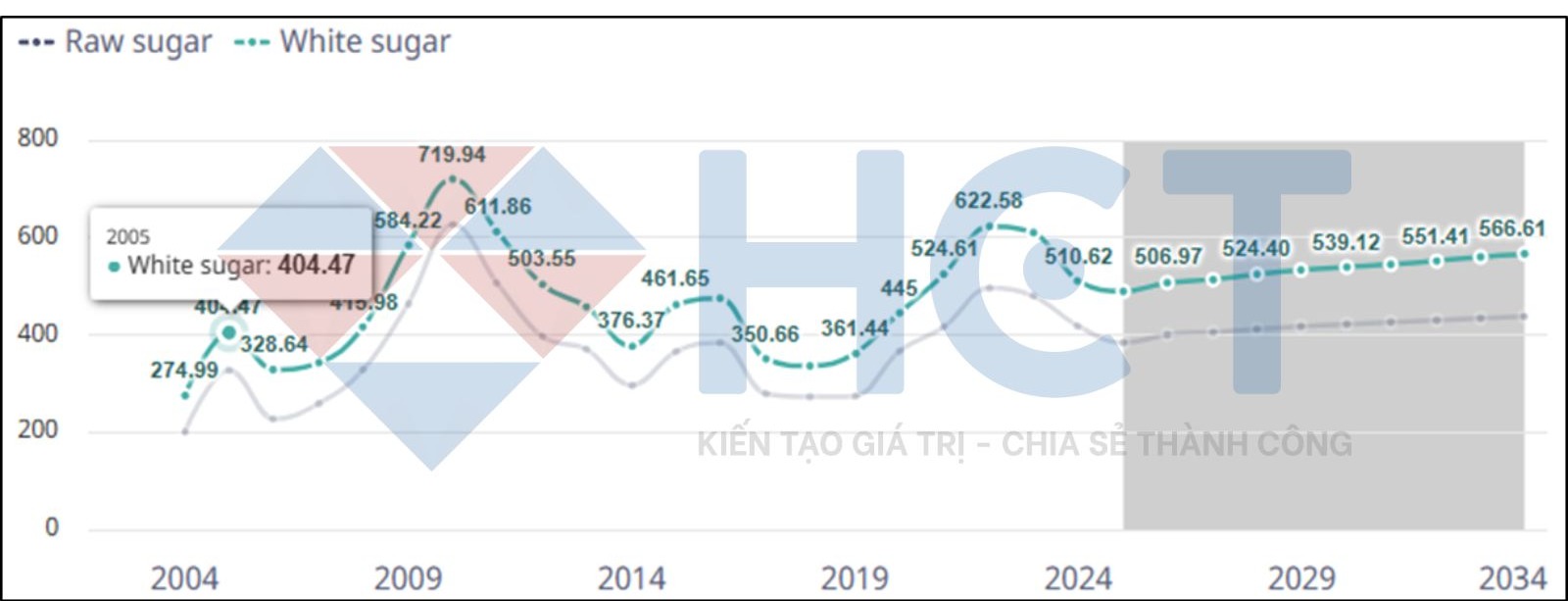 Nhu cầu tiêu thụ đường trên toàn cầu dự kiến tiếp tục tăng trưởng trung bình khoảng 1.2% mỗi năm trong giai đoạn 2025-2034, đạt mức 202 triệu tấn vào cuối giai đoạn này. Sự gia tăng này chủ yếu đến từ các nước có thu nhập thấp và trung bình tại châu Á và châu Phi, nơi dân số tăng nhanh và mức sống được cải thiện rõ rệt, kéo theo nhu cầu tiêu dùng đường tăng theo.