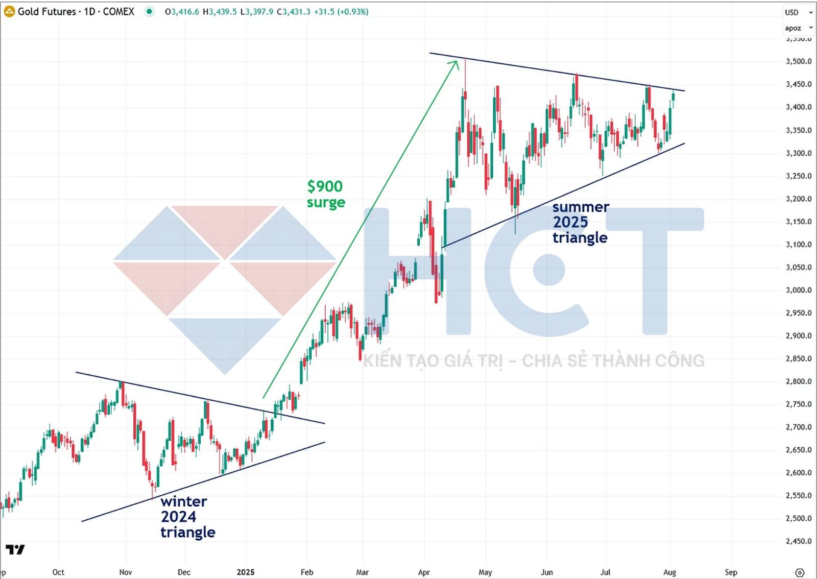 Giá vàng đã dao động trong biên độ hẹp 3.200 – 3.450 USD/oz kể từ cuối tháng 4 và co lại trong vùng 3.300 – 3.400 USD suốt từ cuối tháng 6. Cú điều chỉnh thất bại tại mốc 3.440 USD trong hai phiên 22–23/7, cùng với tâm lý thị trường dịu lại sau căng thẳng thương mại, đã đẩy giá giảm dần cho đến thời điểm công bố dữ liệu việc làm Mỹ tuần trước.